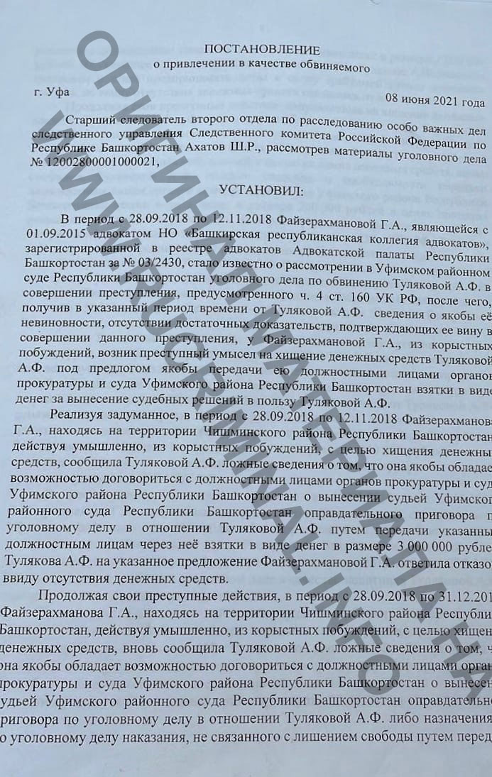 В июне 2021 года Файзерахмановой предъявлялось обвинение в том, что она была посредником в передаче взятки по эпизоду с судьей Джояни. Но затем почему-то прокуратура и СК передумали и предъявили окончательное обвинение в мошенничестве.